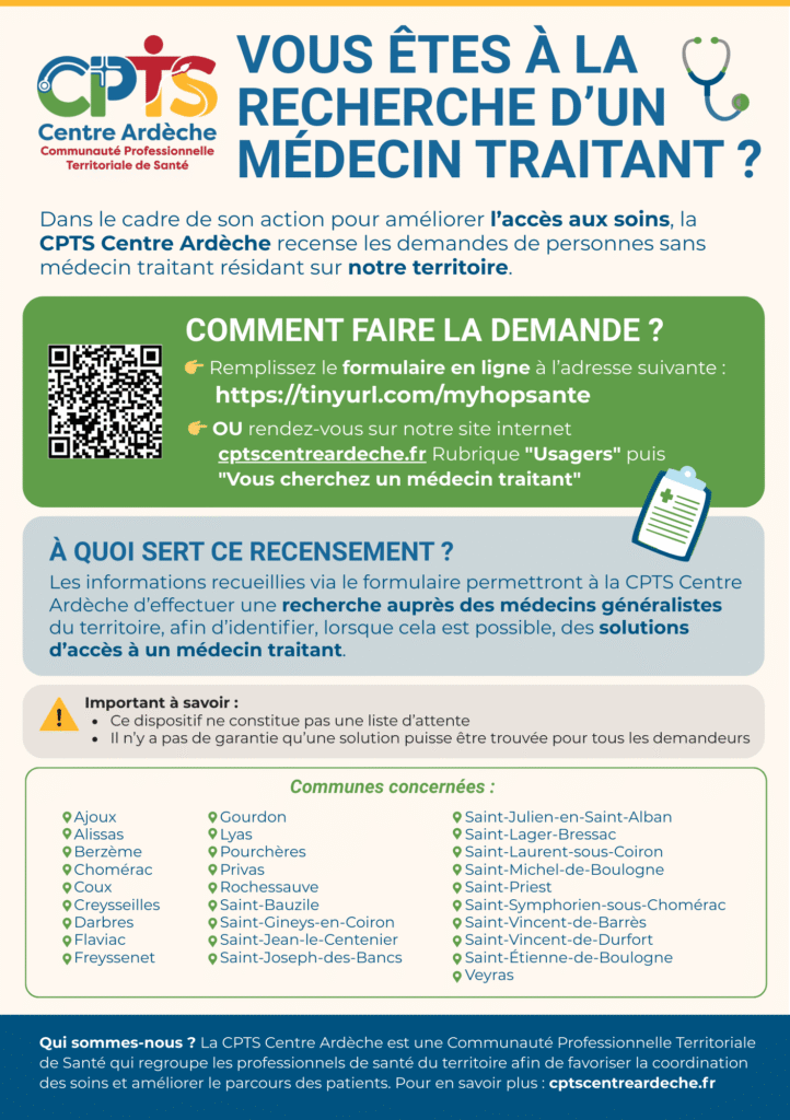 Cette liste vous oriente vers les structures hospitalières, les permanences de soins et les numéros d’appel utiles sur le territoire de la CPTS Centre Ardèche.